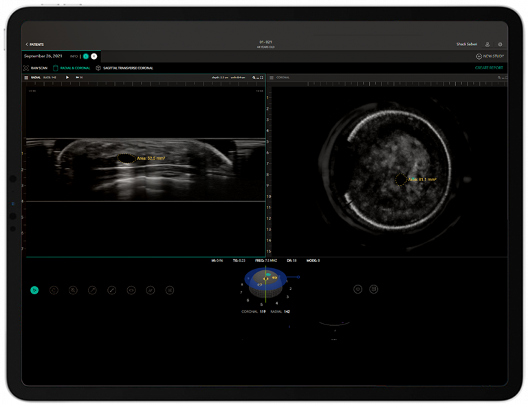 Марьям Зиаи: Система ATUSA™ — это первое в своём роде автоматизированное и носимое трёхмерное ультразвуковое исследование молочной железы. Сканер ATUSA прикрепляется к носимому аксессуару, который размещает весь объем груди в поле зрения сканера. Система захватывает весь объем груди, автоматически сканируя линейным датчиком поверхность груди всего за две минуты без помощи рук. Программное обеспечение будет отображать изображения в режиме реального времени во время сканирования, а затем реконструирует и отображает трёхмерные объёмные ультразвуковые изображения в различных плоскостях, позволяя врачу комментировать и создавать отчёты на основе своих результатов. Программное обеспечение предназначено для полной интеграции с различными алгоритмами машинного обучения, чтобы помочь врачам в обнаружении и классификации областей интереса.