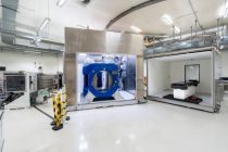 Линия луча системы протонной терапии (слева) с открытой системой Аврора-ПТ (т.е. лучевая МРТ (в центре) и кушетка пациента (справа)). Изображение предоставлено […]… далее