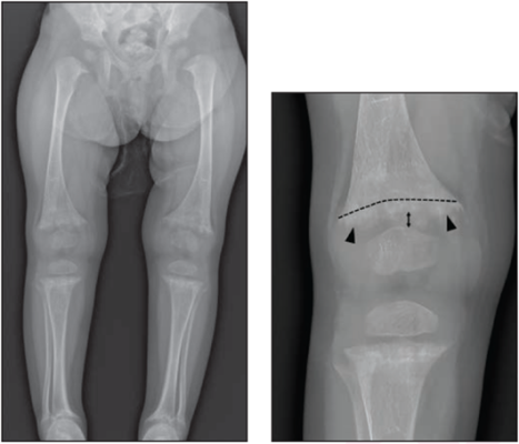 21-месячная девочка с рахитом и уровнем витамина D 5 нг/мл. Слева: двусторонняя рентгенограмма длинных нижних конечностей. Справа: отредактированная рентгенограмма правого колена показывает чашеобразную форму (изогнутая пунктирная линия), истирание (стрелки) и увеличенное расширение физического тела (двойная стрелка) в дистальном отделе бедренной кости с аналогичными данными в проксимальном отделе большеберцовой кости и малоберцовой кости (не аннотировано), все соответствует рахиту. ; на рентгенограмме признаков ХМЛ нет. Все восемь рентгенологов правильно интерпретировали рентгенограмму как показывающую рахит с умеренной или высокой достоверностью.