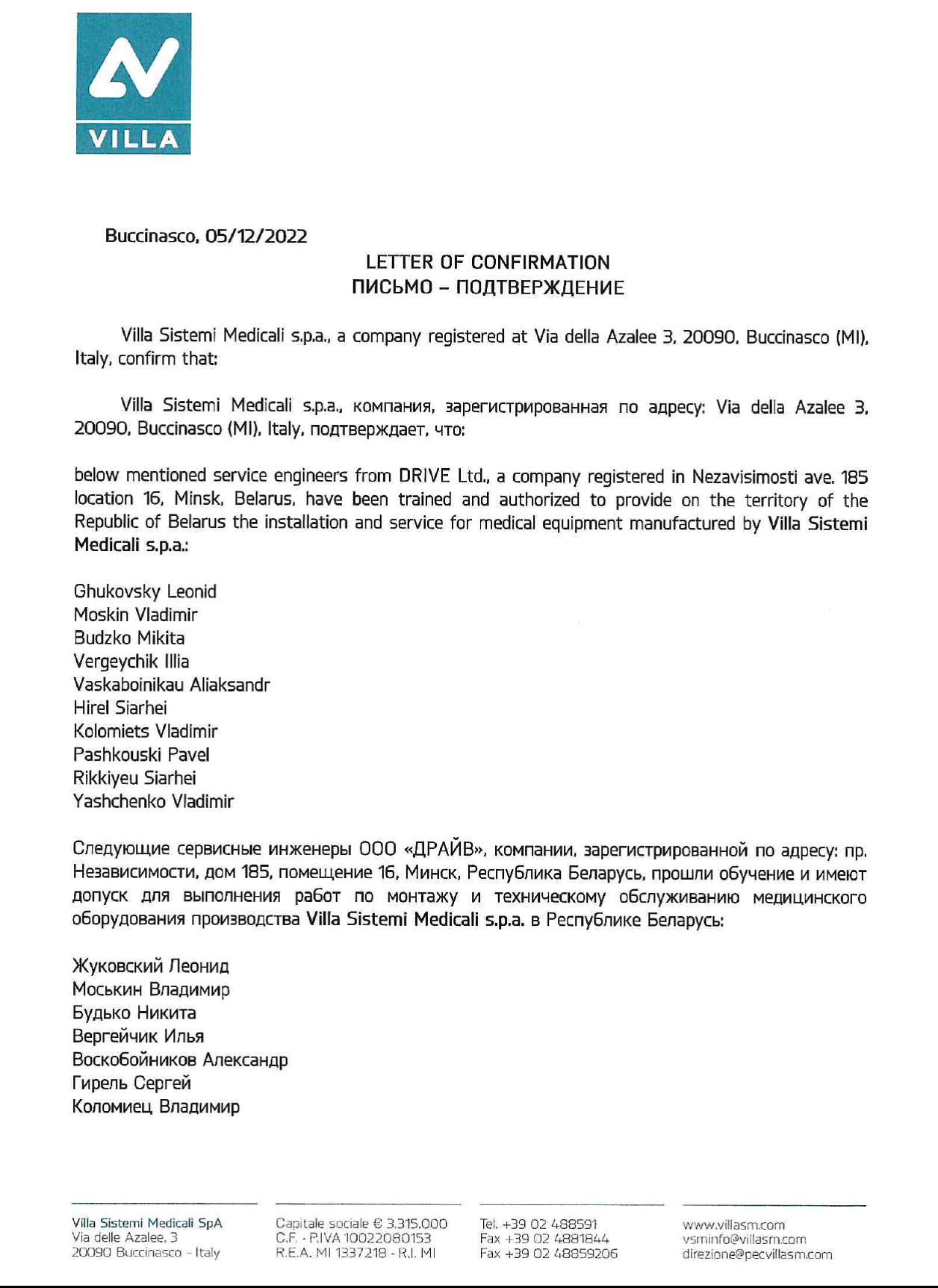 Инженеры компании ДРАЙВ прошли обучение и имеют допуск для выполнения работ по монтажу и техническому обслуживанию медицинского оборудования производства Villa Sistemi Medicali s.p.a.