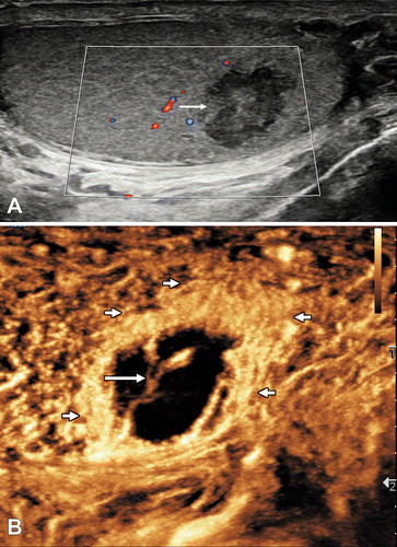 48-летний мужчина обратился с 2-дневной историей внезапно возникшей сильной боли в левой мошонке. (A) Продольное изображение левого яичка при УЗИ в B-режиме демонстрирует смешанную отражающую область (стрелка) без заметной интенсивности сигнала внутреннего цветного допплеровского кровотока. (Б) Продольное УЗ-изображение левого яичка с контрастным усилением демонстрирует окружающее периферическое усиленное усиление (короткие стрелки) и змеевидный сосуд (длинная стрелка), присутствующие в сегментарном инфаркте без усиления. Дифференциация сегментарного инфаркта от абсцесса может быть сложной задачей, потому что оба они могут показать окружающее периферическое усиление и сосудистые проекции ( 2 ); однако маловероятно, чтобы сосудистая структура пересекала абсцесс, как показано в этом случае.
