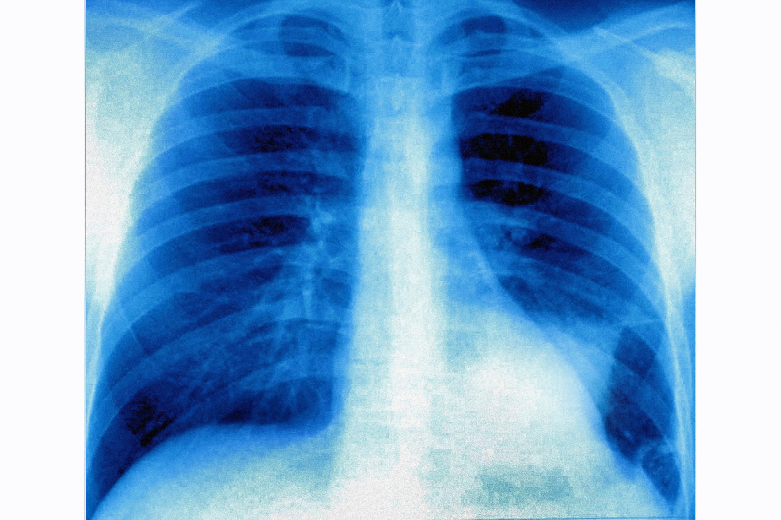 Рак легкого в левой легочной доле, видимый на фронтальном рентгене грудной клетки. (Фото: BSIP/Universal Images Group через Getty Images)