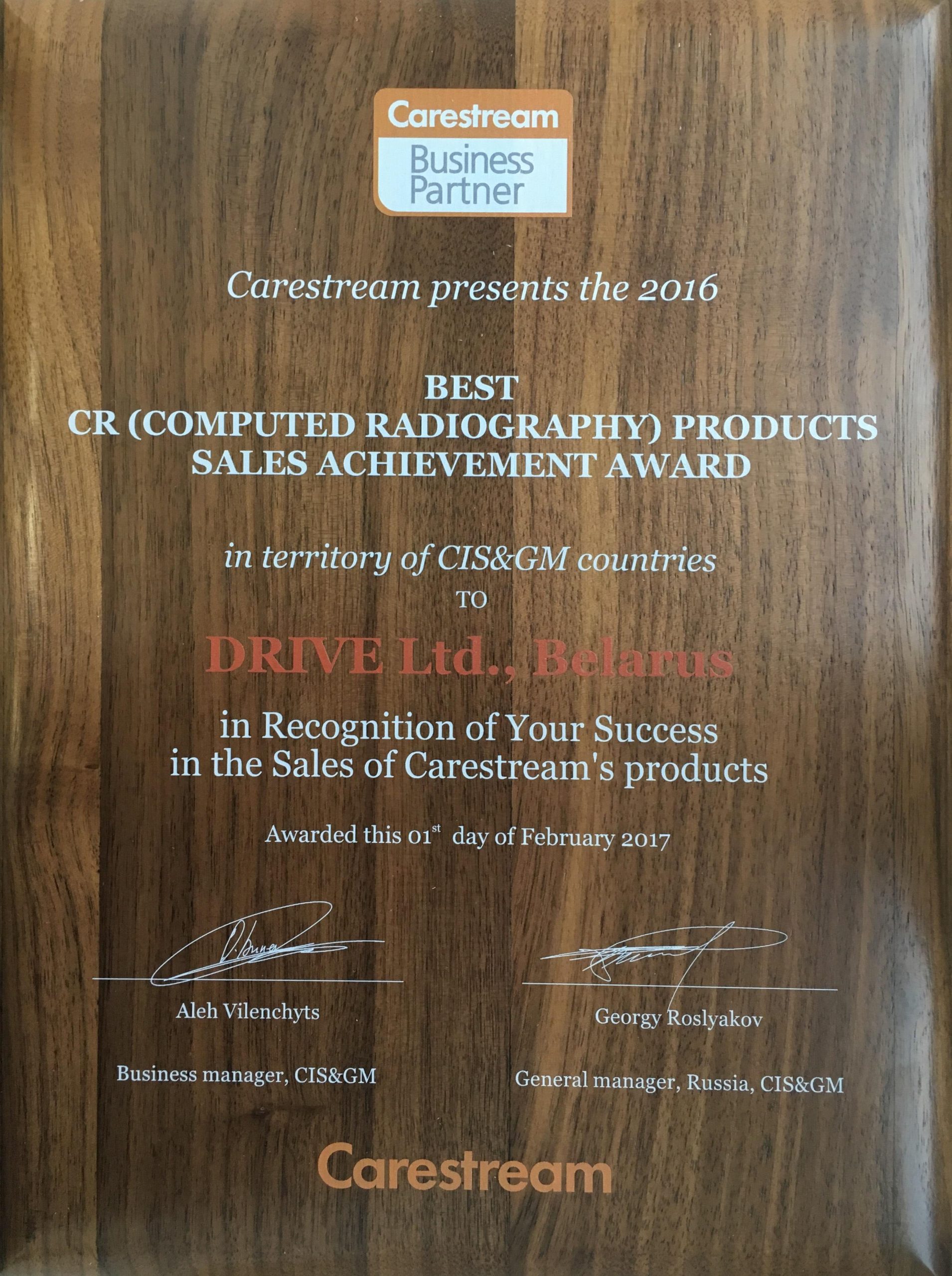 Во время прохождения Европейского конгресса радиологов ECR2017 в городе Вена, по результатам 2016 года, компания Carestream Health признала ООО “ДРАЙВ” лучшей сервисной службой и лучшим продавцом CR систем на территории бывшего СССР.