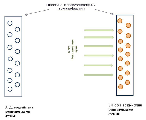 Работа CR системы (Computed Radiography) основана на фиксации пространственного рентгеновского изображения запоминающими люминофорами. Приёмник изображения представляет собой гибкую пластину, покрытую люминофором с вынужденной люминесценцией, способной хранить поглощённую энергию падающего рентгеновского излучения в квазиустойчивом состоянии, а также излучать эту энергию в виде фотонов при облучении светом видимого или ИК-диапазона. Люминофор должен иметь высокий коэффициент поглощения рентгеновского излучения, а также большую световую отдачу на единицу поглощённой энергии.