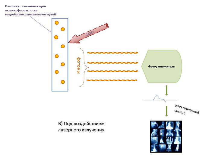 Считывание скрытого изображения производится инфракрасным лазером, который стимулирует люминофор и он отдаёт накопленную им энергию в виде видимого света (рис. 8-3). Этот феномен называется фотостимулированной люминесценцией. Она, как и свечение обычных усиливающих экранов, пропорциональна числу рентгеновских фотонов, поглощённых запоминающим люминофором.