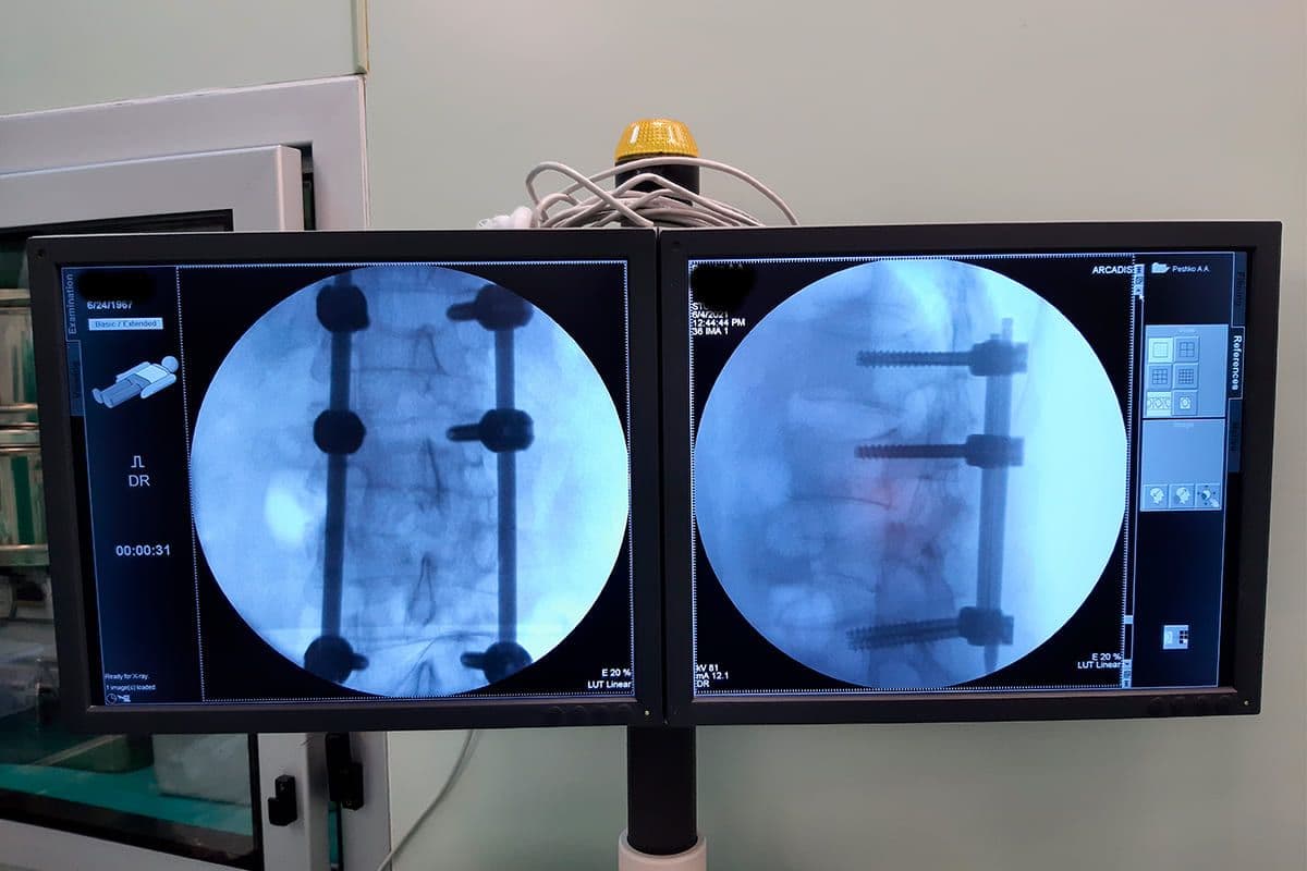 Для этих целей в РНПЦ ТО был разработан метод малоинвазивного хирургического лечения пациентов с повреждениями и заболеваниями грудного и поясничного отделов позвоночника с применением чрескожного транспедикулярного фиксатора позвоночника и кооперации с отечественным производителем «Медбиотех» подготовлена конструкция нового поколения на основе полиаксиального транспедикулярного винта с двойной фиксацией с необходимым монтажным инструментарием. Суть метода заключается в установке транспедикулярных винтов через небольшие разрезы кожи в проекции межпозвонковых суставов, позволяющие через разведенные мышечные волокна визуализировать точки введения винтов, при этом минимально травмируются сосуды и нервы. После установки всех винтов через дополнительные разрезы устанавливаются штанги, последние плотно фиксируются в головках винтов после выполнения при необходимости тракции по оси штанг.
