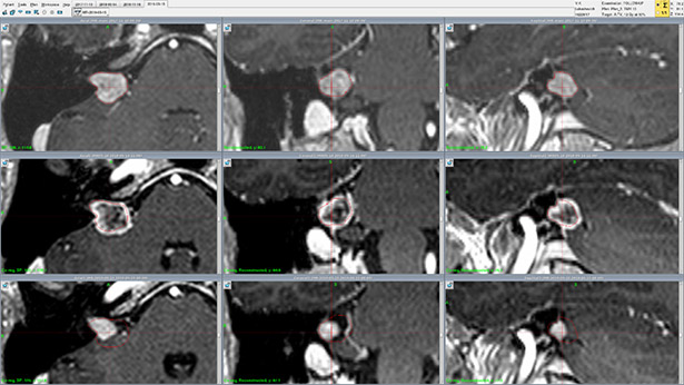 В систему импортируется предшествовавшая радиохирургия, стереотаксическая система которой используется как референсная. Контрольное МРТ совмещается с исследованием на момент радиохирургии и с предыдущими контролями. После этого можно производить оконтуривание и измерение линейных размеров и объема мишеней на контрольном МРТ.