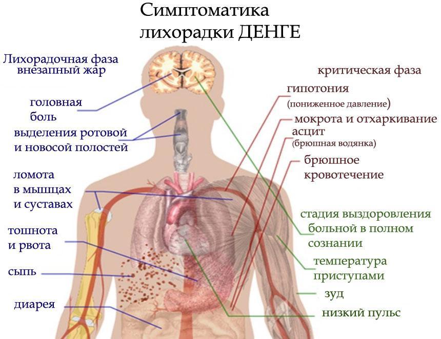 Выделяют четыре известных типа вируса денге. После болезни тот, кто был поражен вирусом одного типа, на пару лет получает иммунитет от этого типа вируса и на 2-3 месяца и от других трёх видов. Этого обычно хватает, чтобы собрать чемодан и купить билет обратно в Европу. Хотя есть доказанные случаи повторного заражения. Чаще всего лихорадка тяжкой формы поражает человека, уже переболевшего лёгкой. Симптомы болезни лишь отчасти напоминают обычный грипп. Это и повышение температуры вплоть до 40 градусов несколько раз с амплитудой в 2-3 дня. Повышение, а затем резкое снижение частоты пульса, озноб, боли в мышцах и суставах, боль в костях и позвоночнике, полное отсутствие желания есть и пить, вплоть до необходимости вливания жидкости. Упадок сил, тошнота и рвота, бессонница, отёки, покраснение лица, глаз, горла, кожных покровов, сыпь, постепенно захватывающая все тело, точечные кровоизлияния, отвратительные розовые волдыри, достигающие размера 5-рублевой монеты и больше, зуд. И это лёгкая, всего лишь легкая форма… Геморрагическая лихорадка приносит ещё и кашель, заканчивающийся кровавой рвотой, увеличение печени и лимфоузлов, сильные боли в животе. При этом кровь идет из дёсен, начинаются  желудочно-кишечные кровотечения, синюшность кожи, падение пульса и давления. Часто больной впадает в коматозное состояние.