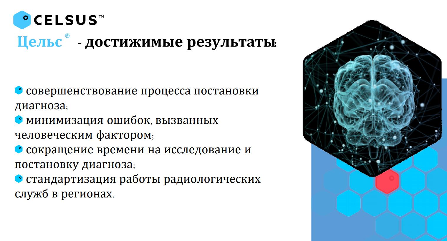 Цельс применяется в маммографии, флюорографии, гистологии и компьютерной томографии легких. Он анализирует цифровые медицинские снимки и выявляет на них малейшие признаки патологических изменений, в том числе онкологии на ранних стадиях. Использование искусственного интеллекта сокращает время на проведение исследования и минимизирует риски пропуска патологии.