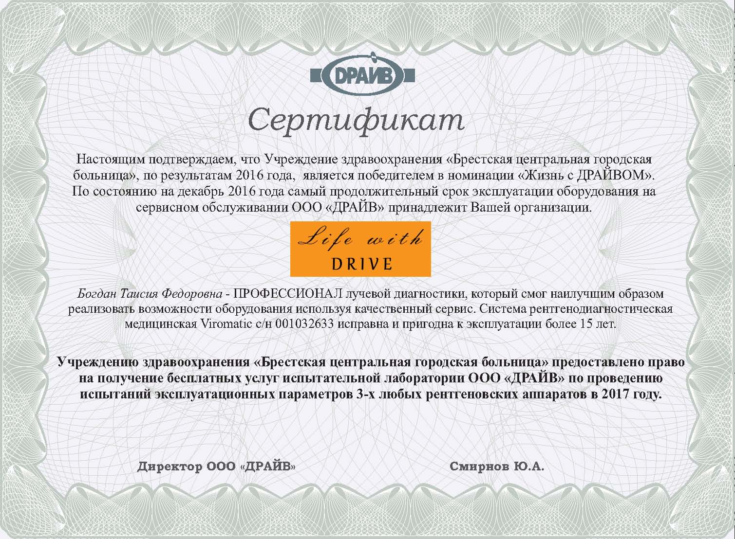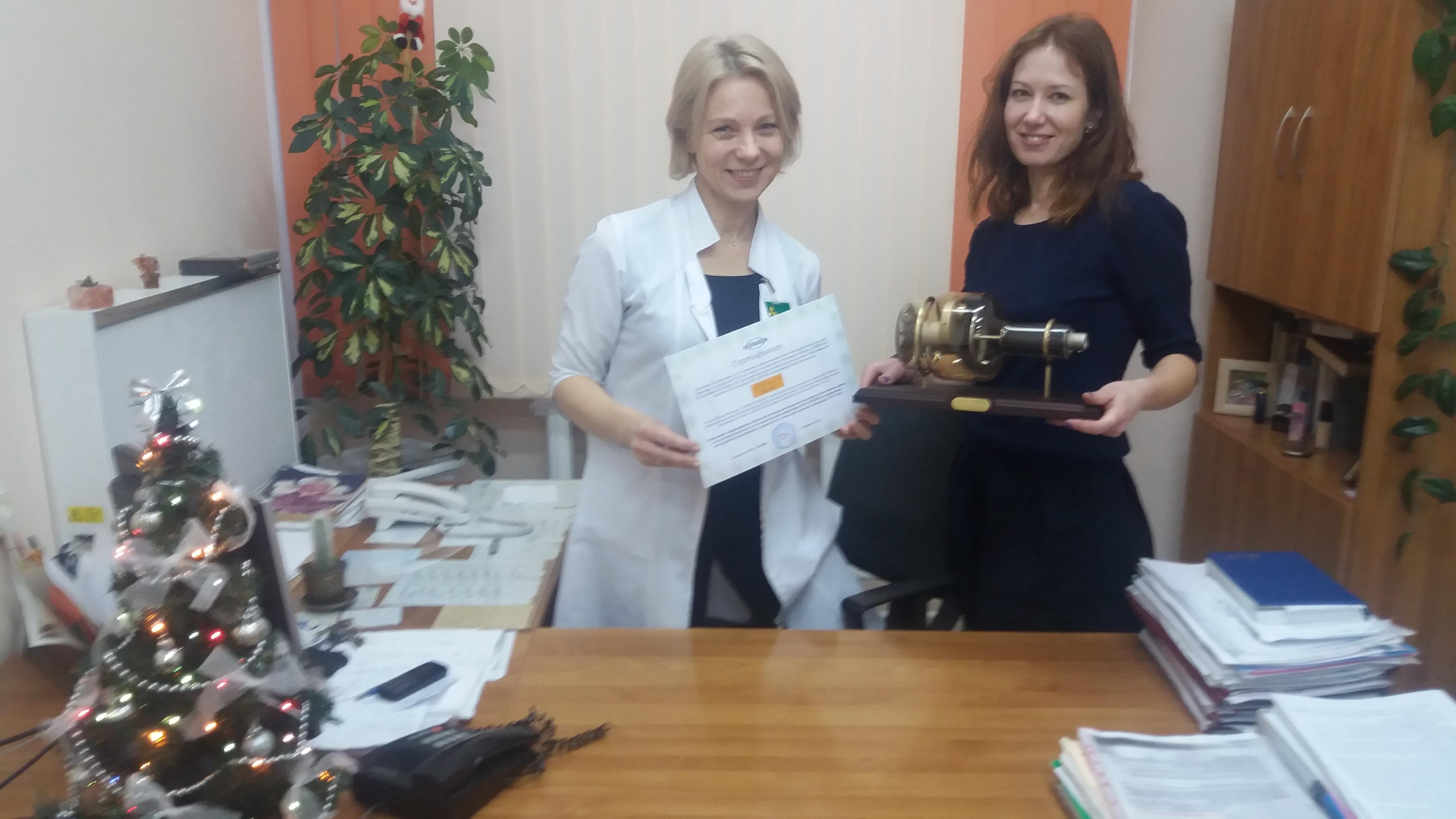 Помимо памятного приза, изготовленного нашими инженерами, сотрудникам больницы вручен сертификат на право получения бесплатных услуг испытательной лаборатории ООО “ДРАЙВ” по проведению испытаний эксплуатационных параметров 3-х любых рентгеновских аппаратов в 2017 году.