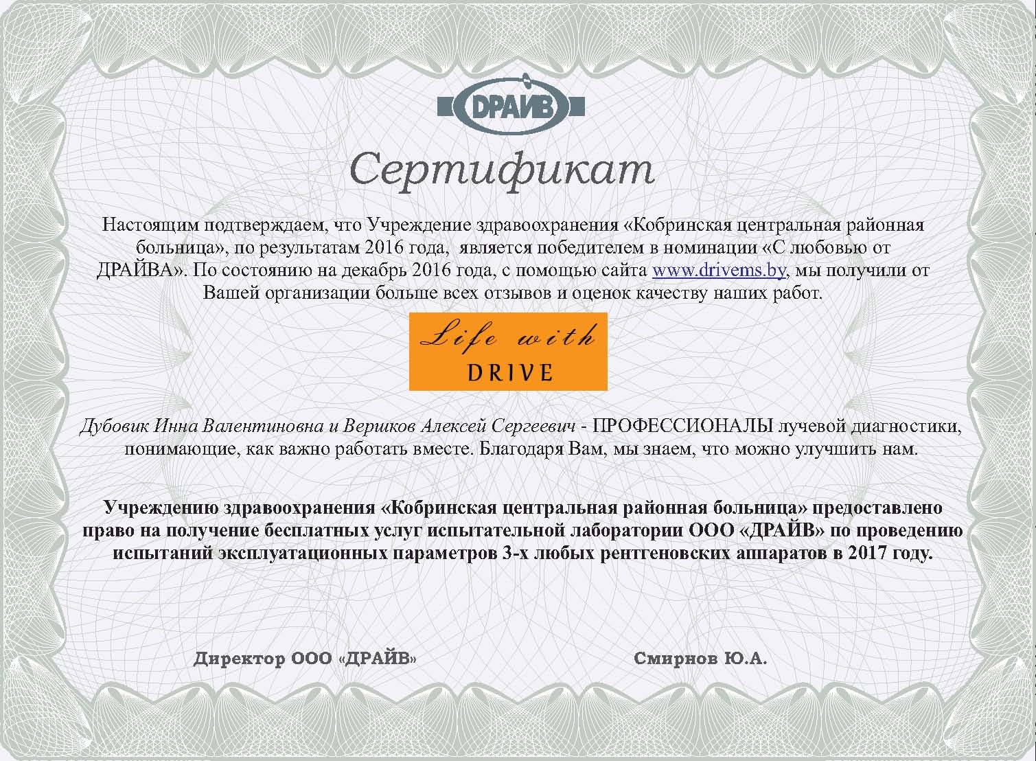 По традиции, победителям вручен сертификат на право получения бесплатных услуг испытательной лаборатории ООО “ДРАЙВ” по проведению измерений эксплуатационных параметров 3-х любых рентгеновских аппаратов в 2017 году!