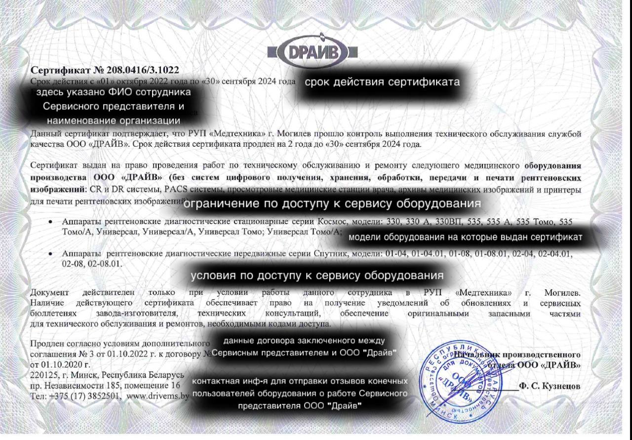 ООО «ДРАЙВ» 4-м организациям. Сервисные инженеры представителей обладают сертификатами, содержащими следующую информацию: